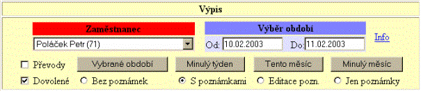 Také mohou provádět převody přesčasů mezi týdny (v případě týdenní evidence) nebo měsíci (v případě evidence měsíční). Je zde také možné prohlížet stav dovolené, takže zaměstnanci mohou zjistit jak dovolenou čerpali, kolik jim ještě zůstává atd. Na následujícím obrázku vidíte příklad týdenního výpisu docházky:
