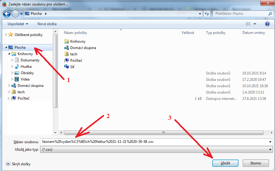 Krok 1 - Výběr vydaných faktur v iDokladu a přechod do exportu![]() Krok 2 - Volba CSV, zatržení všech položek a spuštění exportu. Krok 3 - Uložení exportovaného souboru na váš disk Krok 4 - Soubor uložíte například na plochu nebo do Stažených souborů a podobně Krok 5 - Na tomto webu ve formuláři výše kliknete na tlačítko Procházet Krok 6 - Vyberete soubor Seznam vydanych faktur uložený z iDokladu v předchozím 4. kroku Krok 7 - Po výběru souboru si projděte si další parametry formuláře a proveďte případné úpravy jejich nastavení, které vám více vyhovují. Je také možné načíst adresář firem z Účta, což vám usnadní práci při dalším zpracování faktur v Účtu. Podrobný popis načtení adresáře firem naleznete v této PDF příručce dole v části nazvané Párování firem mezi iDokladem a Účtem Zde stručně popis načtení adresáře firem z účta (nepovinný krok): Krok 8 - Nakonec zkontrolujete další volby výše uvedeného formuláře a kliknete na tlačítko a konverzi spustíte tlačítkem Spusť zpracování pro účto Další kroky postupu včetně ukázky importu do Účta se zobrazí po spuštění importu. Pokud se s celým postupem chce seznámit dopředu, najdete vše v tomto podrobném PDF návodu k přenosu faktur z iDokladu a jejich importu do Účta | ||